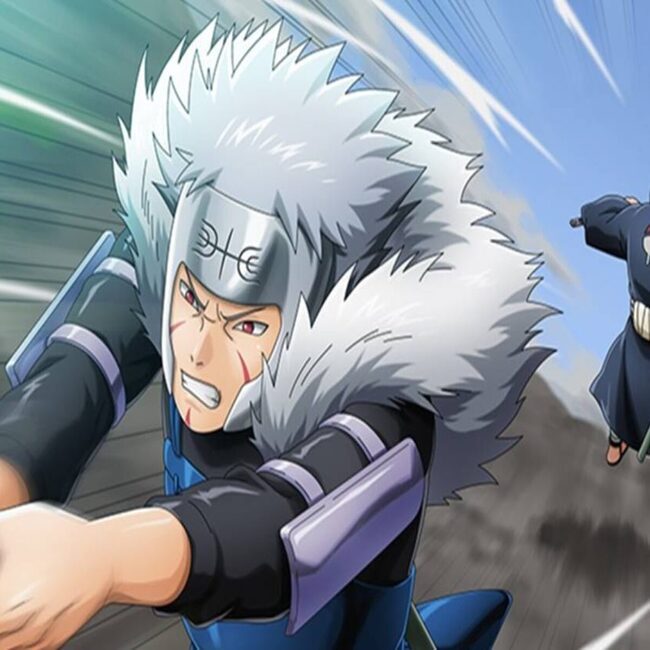 Tobirama is a white, silver-skinned man with shaggy hair and dark eyes. He has three red marks on his face, one under his eyes and one on his chin. In combat, he wears blue armor with his signature white fur collar over a simple black suit.